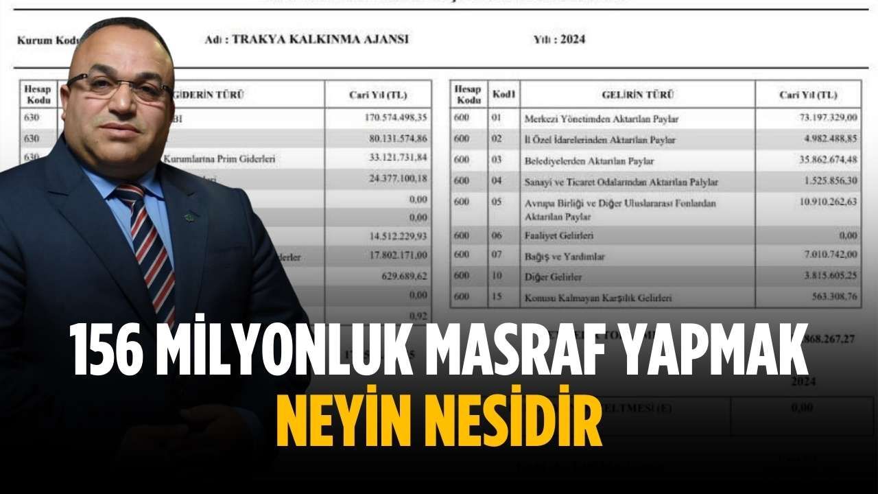 Öyle ki 14 milyon 500 liralık sermaye aktarımı yapmak için 156 milyonluk masraf yapmak neyin nesidir. Biraz detay vermek gerekirse çoğunluğu merkezden olmak üzere belediyeler, il özel idareleri ve ticaret odaları gibi yerel dinamiklerin aktardığı paralarla 2024 yılında 137 milyon 868 bin lira bütçe oluşturan Trakya Kalkınma Ajansı aynı yıl 174 milyon 574 bin lira harcayarak yılı eksi 32 milyon 706 bin lira ile içerde kapatmış. 2024 yılında 134 milyon geliri olan kalkınma ajansının sadece personel maaş ve sigortaları için 113 milyon harcayarak gelir bütçesinin %80' nini kullanması kimler kalkınmış sorusunun cevabını vermiş aslında.