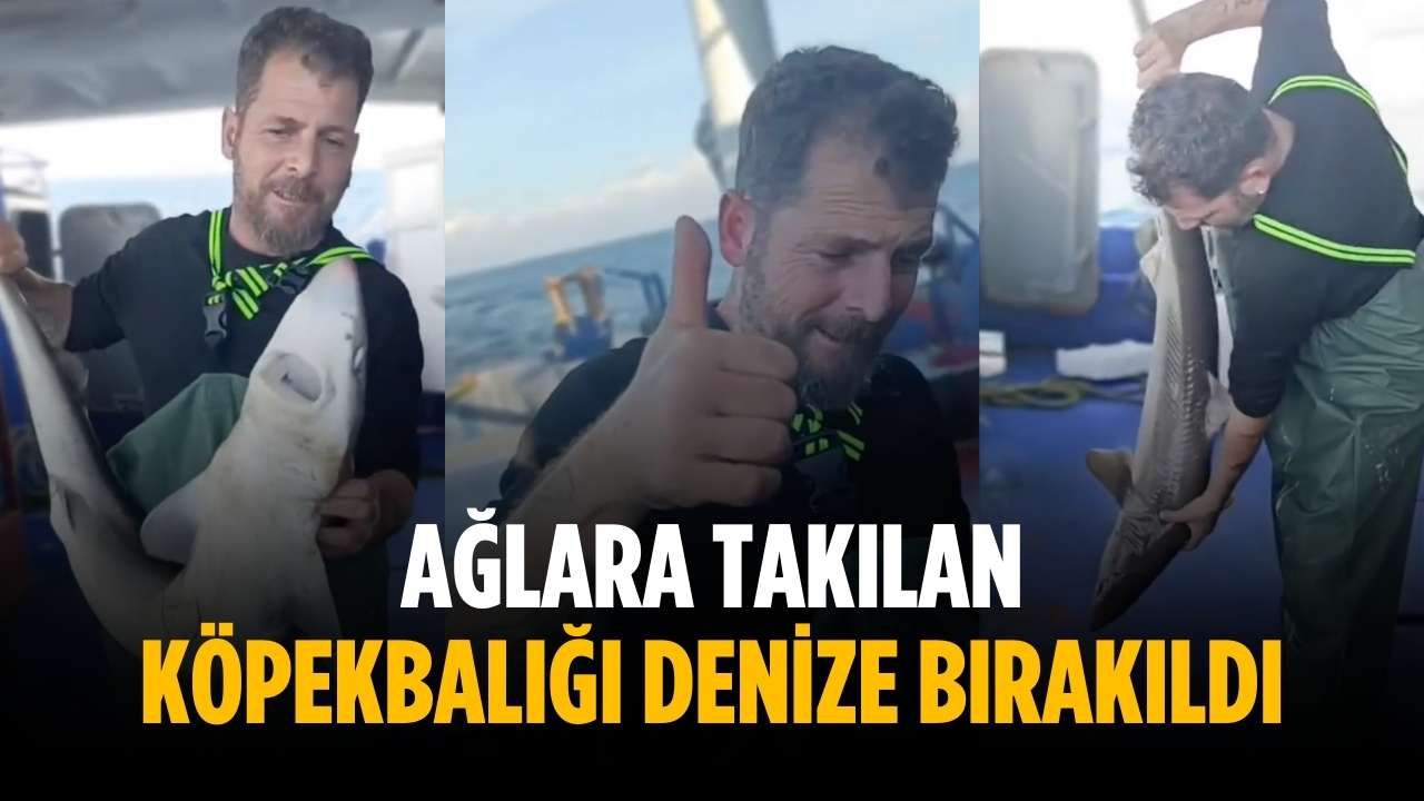 Kırklareli’nin Vize ilçesine bağlı Kıyıköy beldesinde avlanan balıkçı Yasin Püsküllü, ağlara takılan camgöz cinsi köpekbalığını tekneye aldıktan sonra kontrol etti. Köpekbalığının canlı olduğunu fark eden Püsküllü, hiçbir zarar vermeden dikkatlice tutarak denize iade etti.