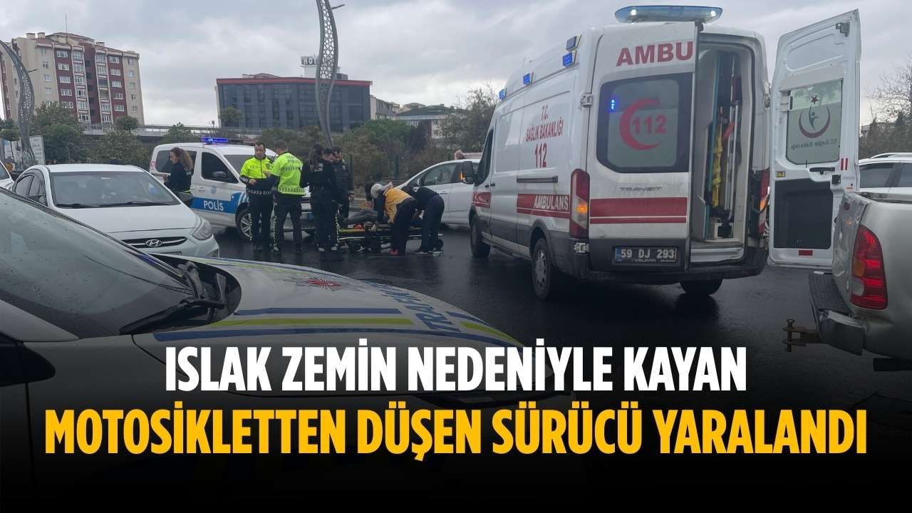 Kayan motosikletten düşen sürücü yaralandı. İhbar üzerine bölgeye gelen sağlık ekipleri yaralı sürücüyü ambulans ile hastaneye kaldırdı.