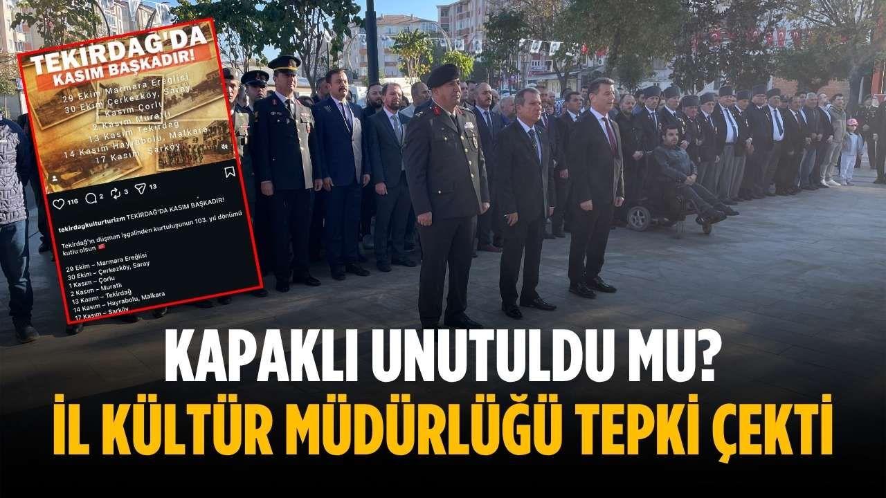 Tekirdağ İl Kültür ve Turizm Müdürlüğü, sosyal medya hesabı üzerinden yayımladığı “Tekirdağ’ın Düşman İşgalinden Kurtuluşunun 103. Yıl Dönümü” mesajında il genelindeki kurtuluş günlerine yer verdi. Ancak, 1 Kasım Kapaklı’nın Kurtuluşu paylaşıma dahil edilmedi.