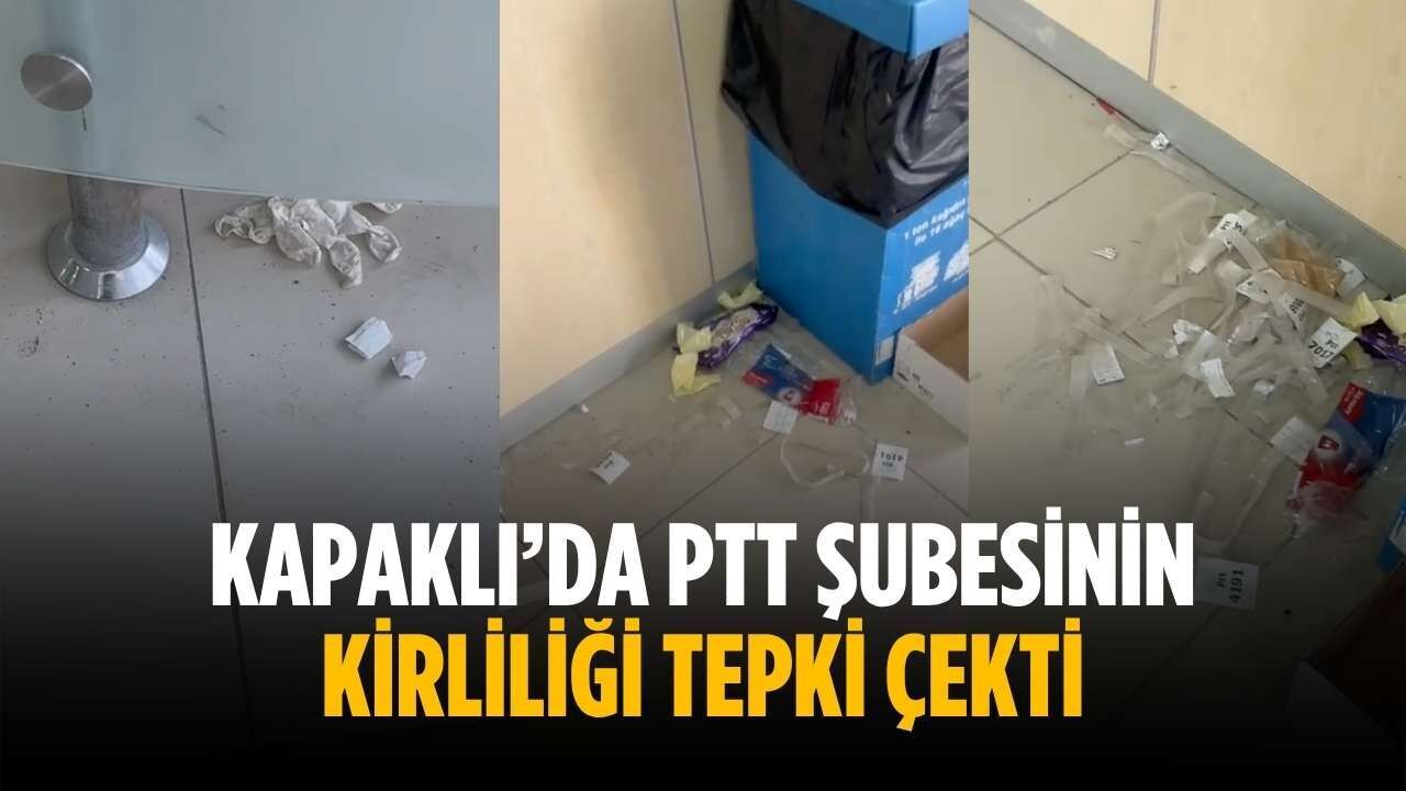 Kapaklı Erbay Caddesi’nde bulunan PTT şubesindeki kirlilik, vatandaşların tepkisine neden oldu. Şube içerisinde plastik eldivenlerden çeşitli kağıt atıklarına kadar birçok çöpün bulunduğu görüldü.
