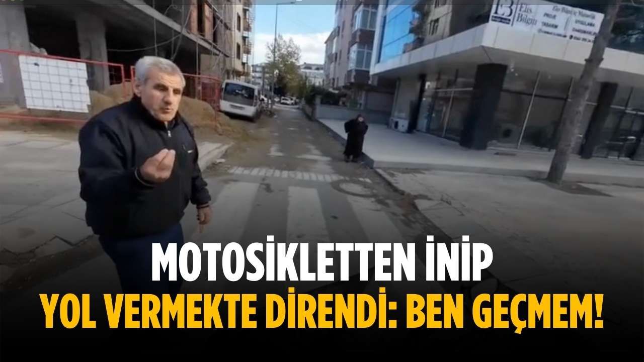 Yaya geçidinden geçmek isteyen vatandaşa yol veren motosiklet sürücüsü, “Geç abi, geç” sözleriyle yayayı yönlendirmek istedi. Ancak yaya da sürücüye “Geç sen” diyerek karşılık verdi. Bunun üzerine motosikletten inen sürücü, kararlı bir şekilde “Ben geçmem” dedi.